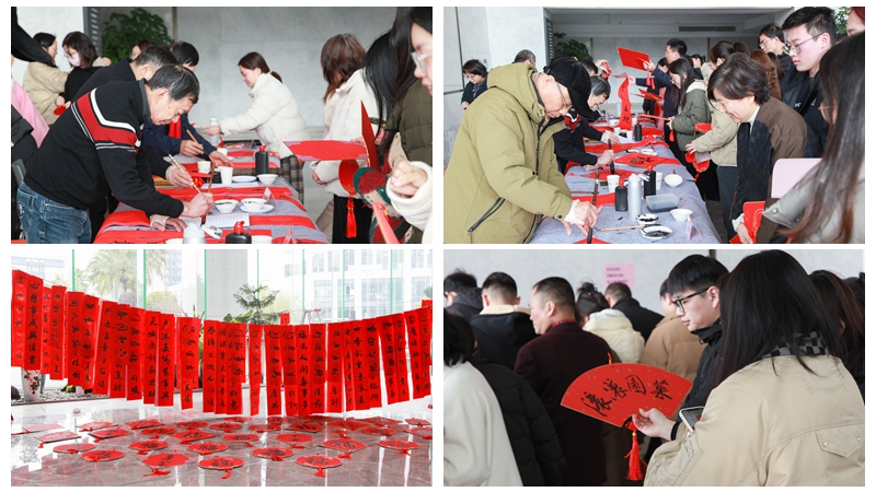 活動現場,歡聲笑語,每個人臉上都洋溢著新春的喜悅。陳波、陳繼生、丁建華、陸雨聲、吳思源、張延利等六位書法大家鋪紙研墨、即席揮毫。不一會兒,一副副飽含美好祝愿和吉祥寓意的大紅春聯和“福”字就鋪滿了現場,行書、楷書、隸書等多種字體各顯神韻。熱烈溫馨的新春氛圍,引得園區內的浙農員工紛紛前來圍觀欣賞,精心挑選心儀的對聯和“福”字。