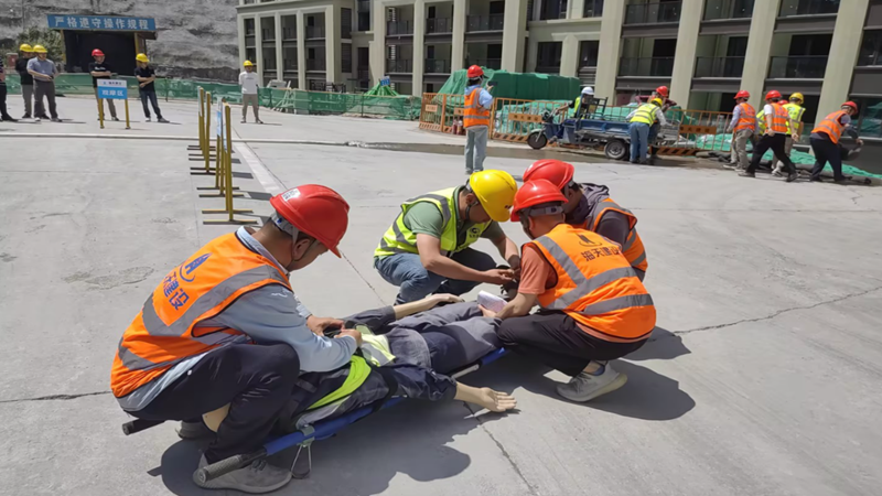 本次演練模擬橫店受臺(tái)風(fēng)影響持續(xù)暴雨,項(xiàng)目三期1#地庫(kù)施工區(qū)域涌進(jìn)大量雨水,積水深度達(dá)到40CM,施工人員被困地下室施工現(xiàn)場(chǎng)。在發(fā)現(xiàn)“險(xiǎn)情”后,演練啟動(dòng)二級(jí)應(yīng)急響應(yīng)機(jī)制,圍繞集結(jié)待命、巡查預(yù)警、疏散搶險(xiǎn)、人員轉(zhuǎn)移等科目開展實(shí)戰(zhàn)演練。演練分工明確,各環(huán)節(jié)協(xié)調(diào)有序。面對(duì)“險(xiǎn)情”,物資組將防汛物資快速運(yùn)至現(xiàn)場(chǎng),搶險(xiǎn)組進(jìn)入現(xiàn)場(chǎng)后檢查電源、照明線路架空,搶險(xiǎn)、救援組進(jìn)行了沙袋封堵、應(yīng)急抽水、人員疏散等科目演練,參演人員快速反應(yīng)、迅速處置,受傷人員按照應(yīng)急預(yù)案及時(shí)轉(zhuǎn)移并臨時(shí)救護(hù),整個(gè)過程表現(xiàn)出良好的團(tuán)隊(duì)合作精神。